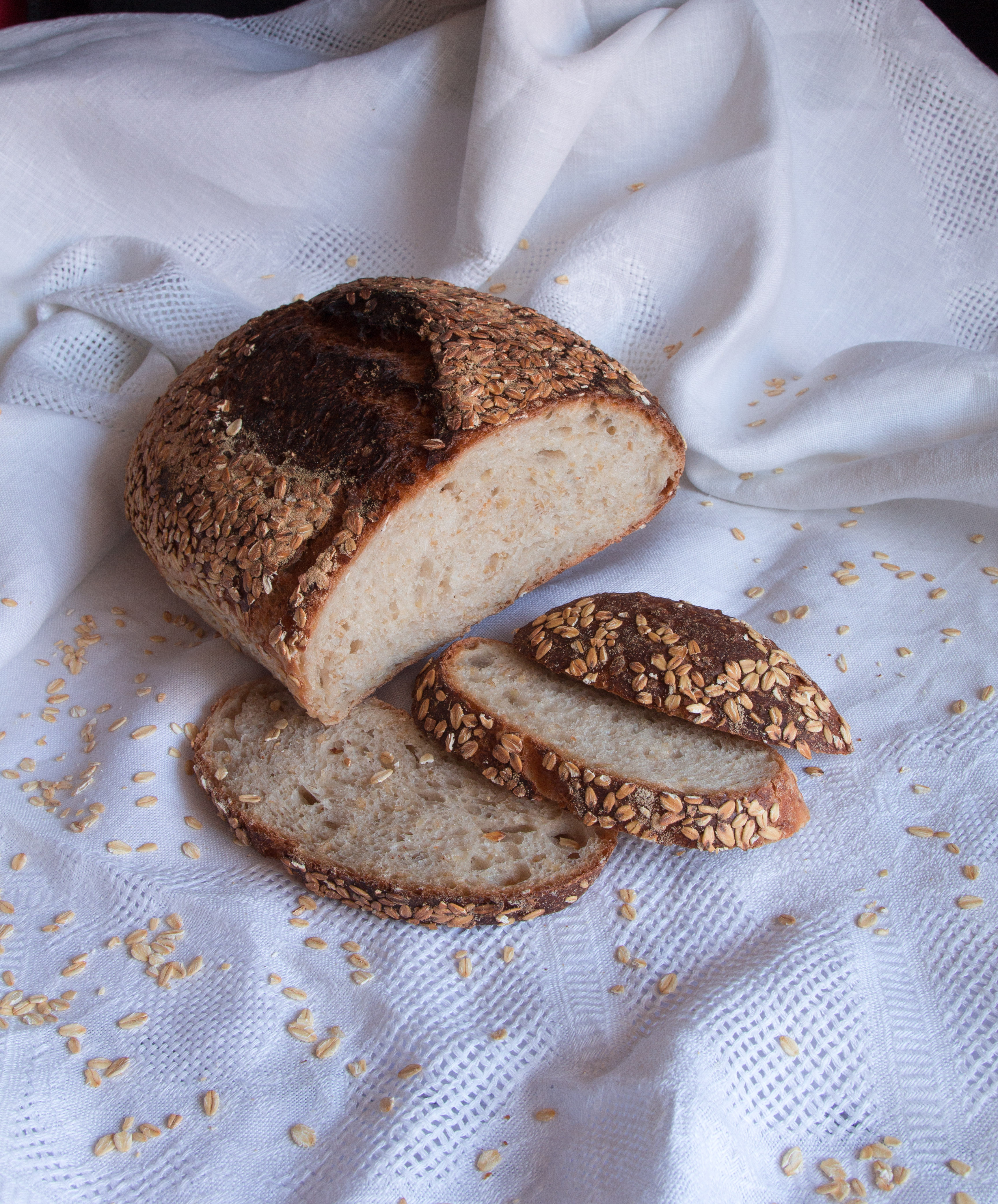 Spolverate leggermente due cestini da lievitazione rotondi o ovali da 22x33 cm con farina. (qui servirà meno farina rispetto ad altri pani a causa della crosta di avena.)